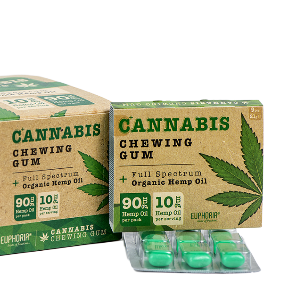 Confezione da 9 gomme da masticare senza zucchero con edulcoranti, con olio di semi di canapa.