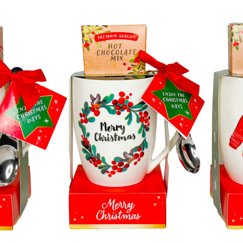 Un set natalizio goloso e pratico: tazza decorata, cucchiaino incluso e cioccolata calda in gusti misti!